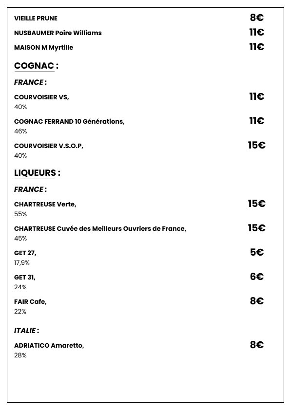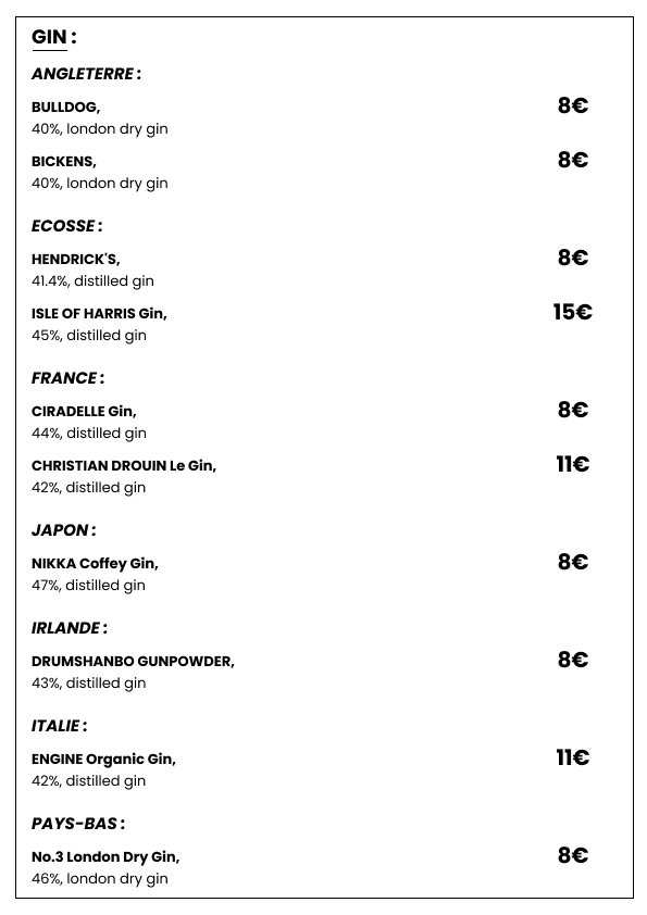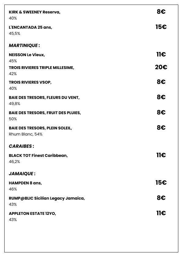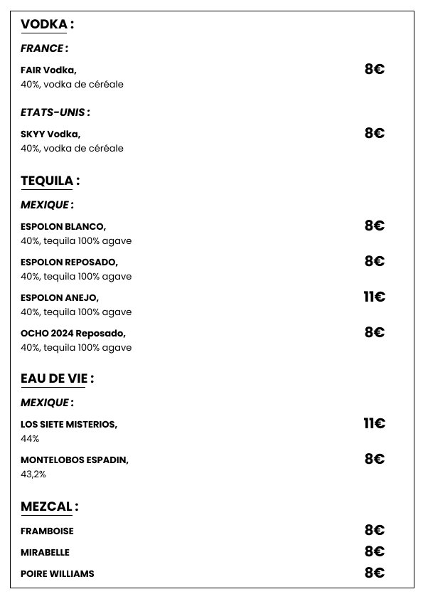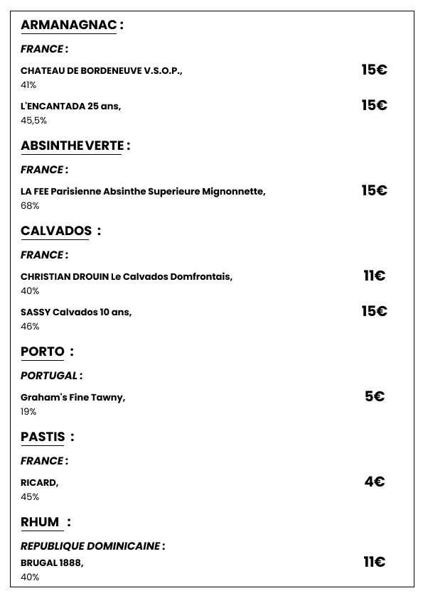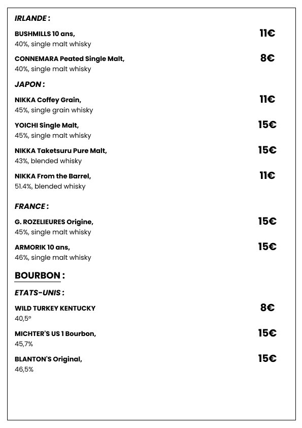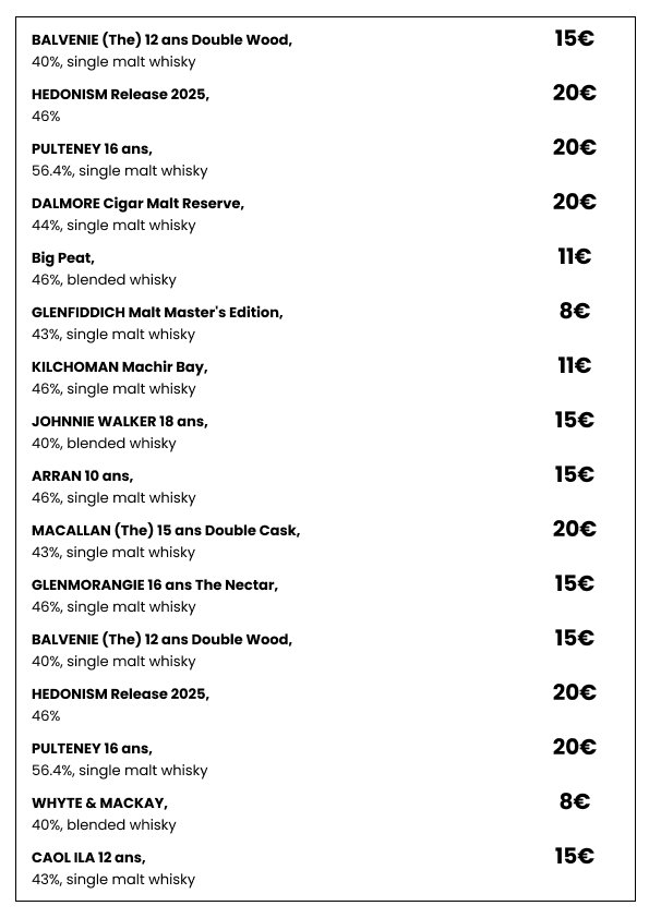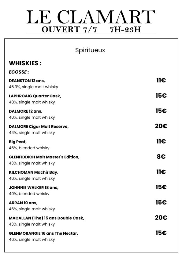 Plongez dans une sélection de spiritueux choisis avec soin pour satisfaire les amateurs de belles bouteilles. Whiskies de caractère, rhums parfumés, vodkas premium et autres découvertes vous attendent pour sublimer vos fins de repas ou accompagner vos soirées dans l’ambiance chic et décontractée de Le Clamart.