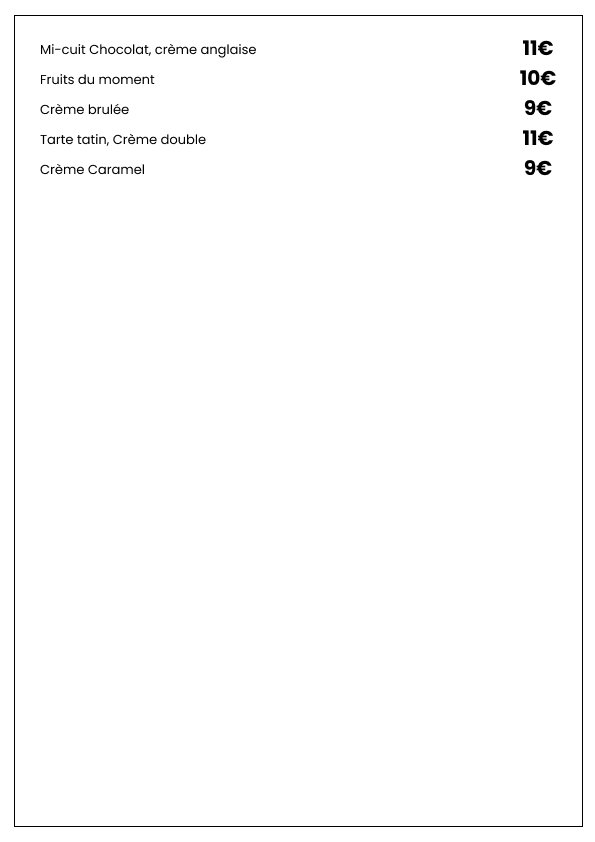 Nos tarifs sont affichés sur notre ardoise, en fonction des inspirations du chef et des produits du marché.